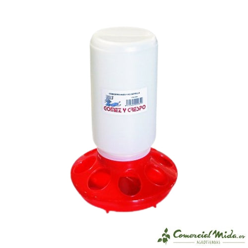 El comedero para aves pequeñas de Gómez y Crespo cuenta con una botella con capacidad de 1kg. El anillo anti desperdicio ayuda a ahorrar pienso evitando que las aves estraguen el pienso.