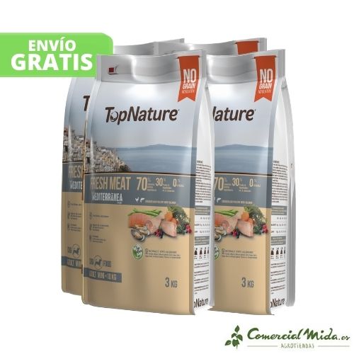 El pienso TopNature Receta Mediterránea con carne fresca de pollo y salmón es un alimento seco para perros adultos de razas pequeñas naturalmente hipoalergénico ideal para reforzar la salud osteoarticular de articulaciones y ligamentos gracias a la glucosamina y el condroitin. Además, favorece la salud dental del perro mini gracias a una croqueta más pequeña adaptada a su mandíbula y que favorece la acumulación de la placa en los dientes. Esta comida seca es ideal para perros de compañía alérgicos al gluten y los cereales y está compuesta por ingredientes de excelente calidad e ingredientes adaptados a sus necesidades nutricionales.