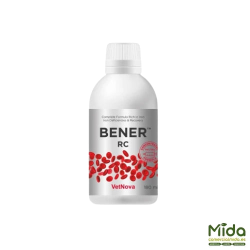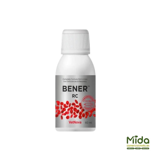 Bener RC es un complemento vitamínico-mineral completo para perros y gatos, disponible en solución oral y chews altamente palatables, diseñado para apoyar en casos de déficit de hierro, falta de apetito y periodos de recuperación. Su avanzada fórmula con 11 nutrientes esenciales favorece la formación de glóbulos rojos y hemoglobina, contribuyendo a mejorar la energía y el estado general del animal. Destaca por su contenido en hierro, cobre, vitaminas del grupo B y vitamina K₃, clave para el correcto funcionamiento del sistema hematológico.